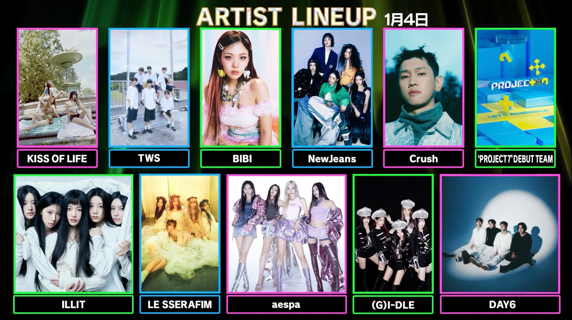 初日となる1月4日(土)には、(G)I-DLE、aespa、ILLIT、KISS OF LIFE、LE SSERAFIM、NewJeansら人気ガールズグループや、BIBI、CRUSHといったシンガーソングライター、人気を急加速させている新人ボーイズグループのTWS、今年大ヒットを連続させているDAY6、さらにはデビューメンバーが決定するファイナルの放送を12月27日に控えるサバイバル番組『PROJECT 7』のデビューチームが出演します。