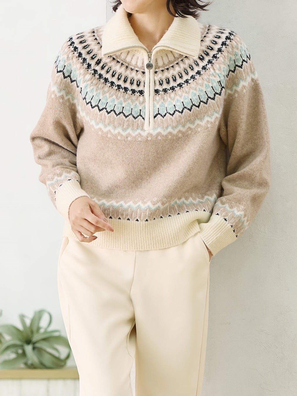 ジップの締め具合で着こなしを楽しめるハーフジップニットです。少し短めの丈のため、パンツともスカートとも相性がよく、すっきり着られます。配色のきれいな求心柄がコーディネートの主役になり、顔周りも華やかな印象に。