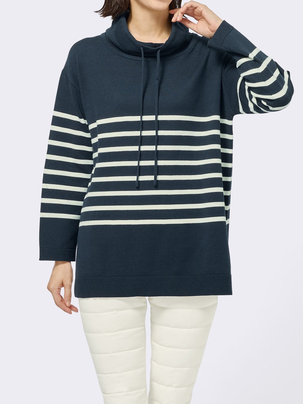 ゆったりとしたシルエットで、気になる腰周りをカバーするニットチュニックです。ボーダーと襟元のドロストがポイントで、スポーティな雰囲気に。オフホワイトとネイビーの配色が爽やかで、細身のパンツを合わせると、すらっと若々しい印象になります。