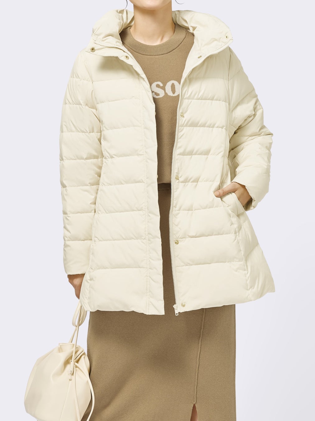 かさ高性に優れ、軽くてあたたかいフレンチダウンを使用したコートです。少しウエストを絞ったシルエットで、ダウンコートながら、すっきりとした印象に。ボリュームのある襟が首周りをあたたかくふんわりと包みます。