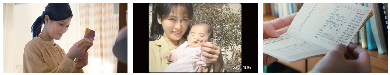 本CM「思い出の口座編」では、主人公の女性が0歳の娘を連れて実家を訪れたことから物語が始まります。母に娘を預けて、自分自身の部屋に向かい本棚の本を手に取ると、本の間から古い通帳が現れます。その通帳には「なな誕生 出生体重預金」「初めての子育て。お母さん頑張るからね」「どんな場所で何をしていても 母はあなたの味方だよ」など、母が長い年月をかけて積立をし、同時に書き残していった想いのメモがあり、子ども時代の母との思い出が一気によみがえります。