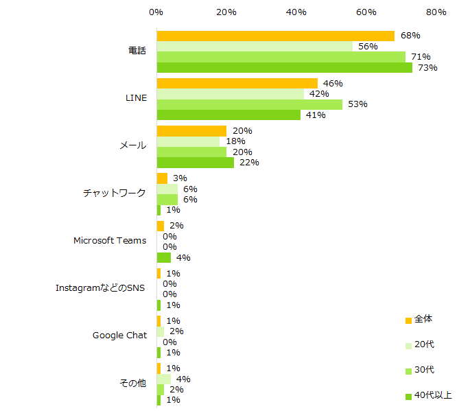 「仕事先では遅刻や欠勤の際の連絡方法に決まりはありますか?(現在お仕事をされていない方は直近のお仕事先での決まりを回答してください。)」と伺うと、「ある」が73%でした。続いて、「ある」と回答した方に「どんな方法で連絡する決まりですか?」と伺うと、88%が「電話」と回答。「ない」と回答した方に「一番連絡しやすいと思う方法は何ですか?」と伺うと、68%が「電話」、次いで46%が「LINE」と回答しました。年代別で見ると、「電話」の回答が20代:56%に対し、30代:71%、40代以上:73%とポイントに差がありました。理由も紹介します。