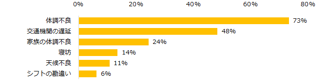 「交通機関の遅延や体調不良などで、お仕事を遅刻・欠勤したことはありますか?」と伺うと、77%が「ある」と回答。また「遅刻・欠勤したことがある」と回答した方に理由を伺うと、トップが「体調不良」(73%)、続いて「交通機関の遅延」(48%)という結果でした。