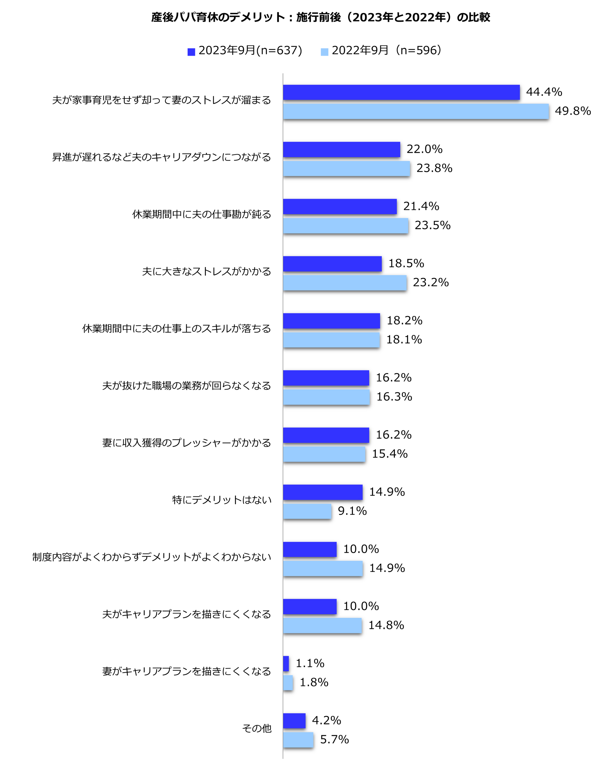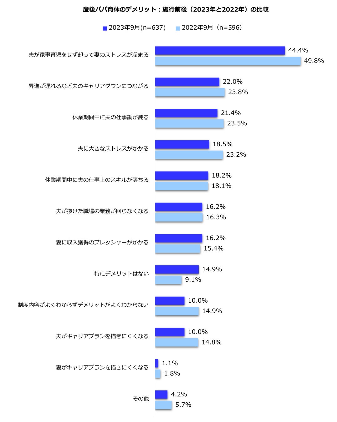 続いて「産後パパ育休の開始によって、どんなメリットがあると思いますか」と尋ねたところ、「家事育児の経験が夫の視野を広げる」が最も多く56.8%。さらに「夫と子どもが、かけがえのない時間を過ごすことができる」、「妻のストレスが軽減される」と続きました。「妻のストレスが軽減される」は施行前より7ポイント以上上昇しています。一方、「産後パパ育休の開始によって、どんなデメリットがあると思いますか」との質問には、「夫が家事育児をせず却って妻のストレスが溜まる」が最も多く44.4%でした。施行前よりは比率がやや減少しているものの、2位の「昇進が遅れるなど夫のキャリアダウンにつながる」が22.0%なので、ほぼ2倍と突出しています。メリットにおいてもデメリットにおいても、産後パパ育休が妻のストレスに大きな影響をおよぼすと感じている人が多いことが伺えます。産後パパ育休の成否は、夫の育児が妻のストレスを軽減するか否かが鍵を握っているようです。育児を通じてお子さんとのかけがえのない時間を過ごせることはもちろん、『家オペ力(※2)』を磨くことで仕事に必要なソフトスキルが鍛えられるといったメリットもあわせて産後パパ育休を取得する意義を周知していくことが大切だと考えます。