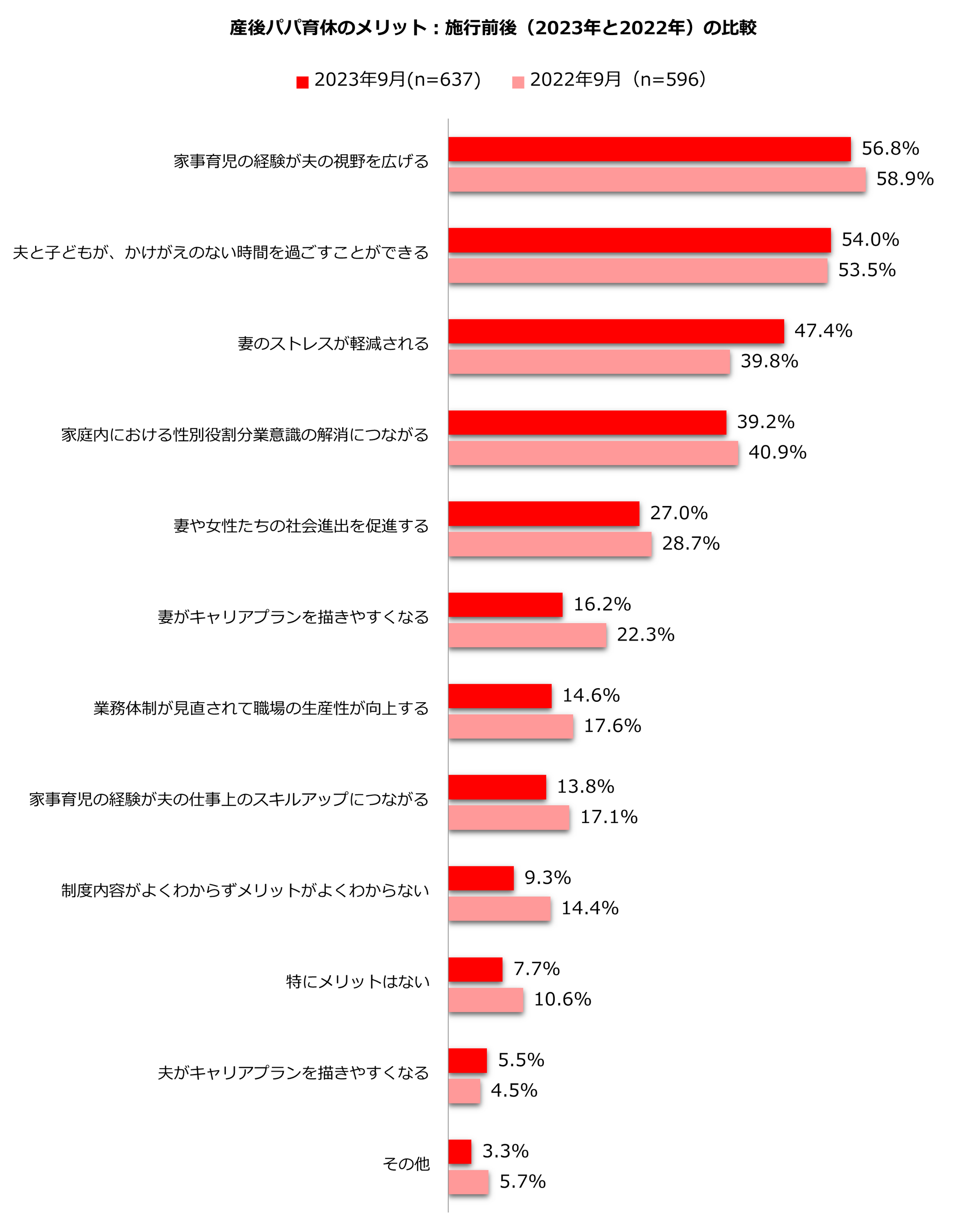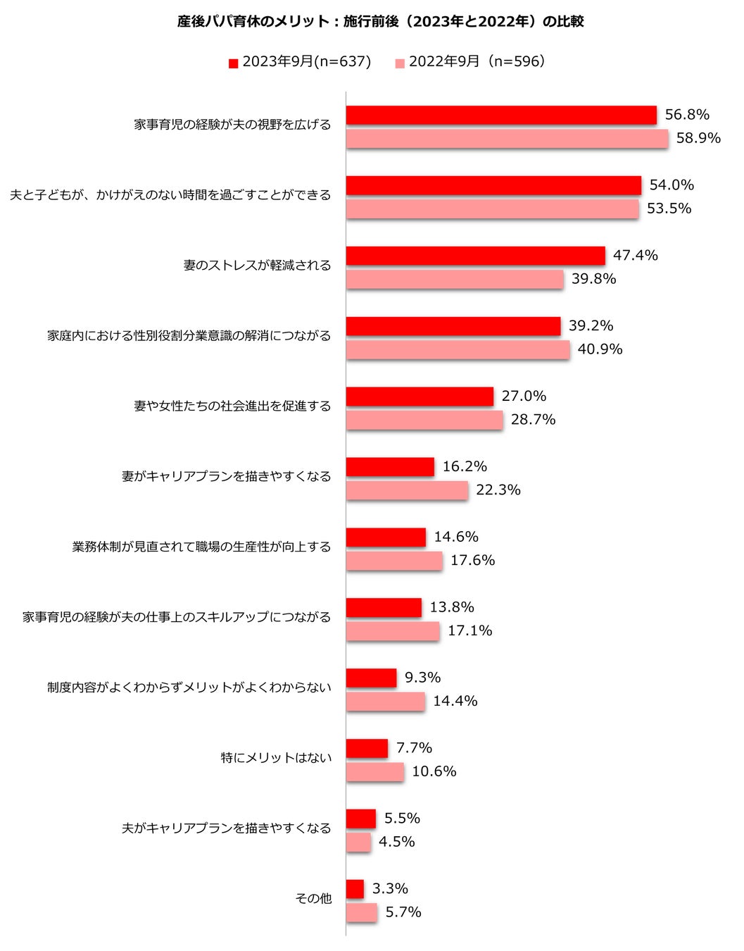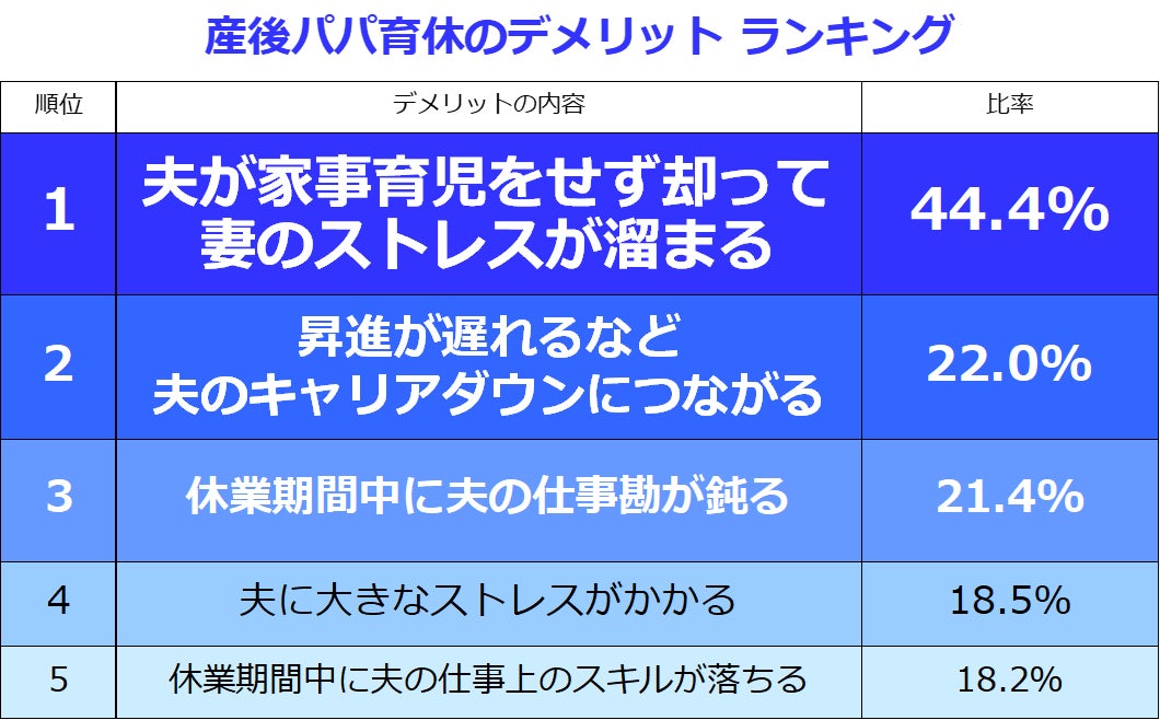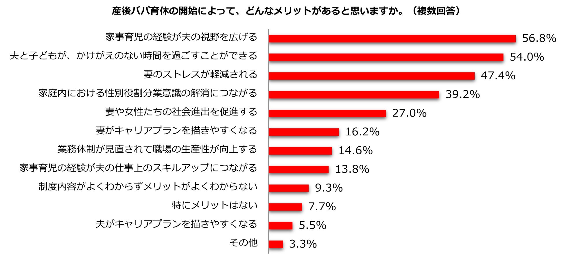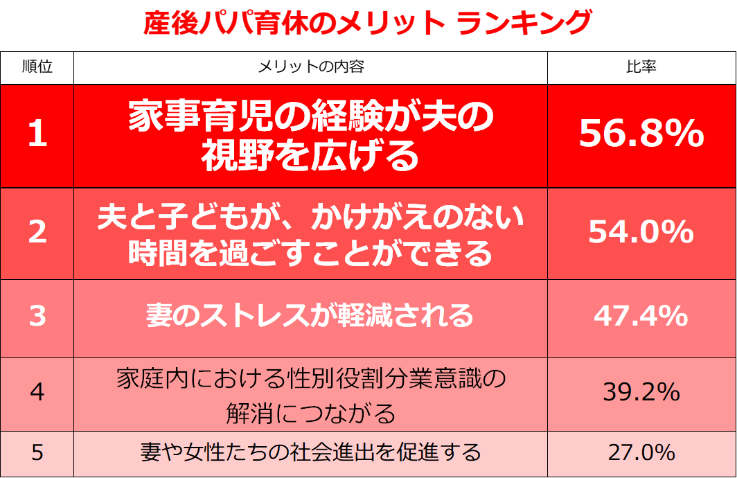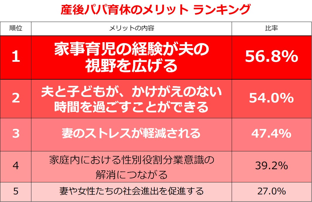 産後パパ育休スタートから一年/メリット1位「夫の視野を広げる」56.8%、デメリット1位「妻のストレスが溜まる」44.4%