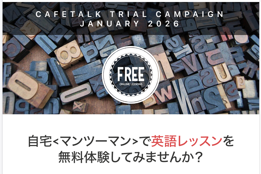 世界140カ国以上の生徒と92カ国以上の講師をつなぐ日本最大級のオンライン習い事サイト「カフェトーク(https://cafetalk.com/ )」を運営する株式会社スモールブリッジ(本社:東京都渋谷区、代表取締役:橋爪小太郎)は、2026年1月、英会話学習をスタートしたい方を対象に、最大3回分のオンライン英会話レッスンを無料提供する「特大モニターキャンペーン」を実施いたします。