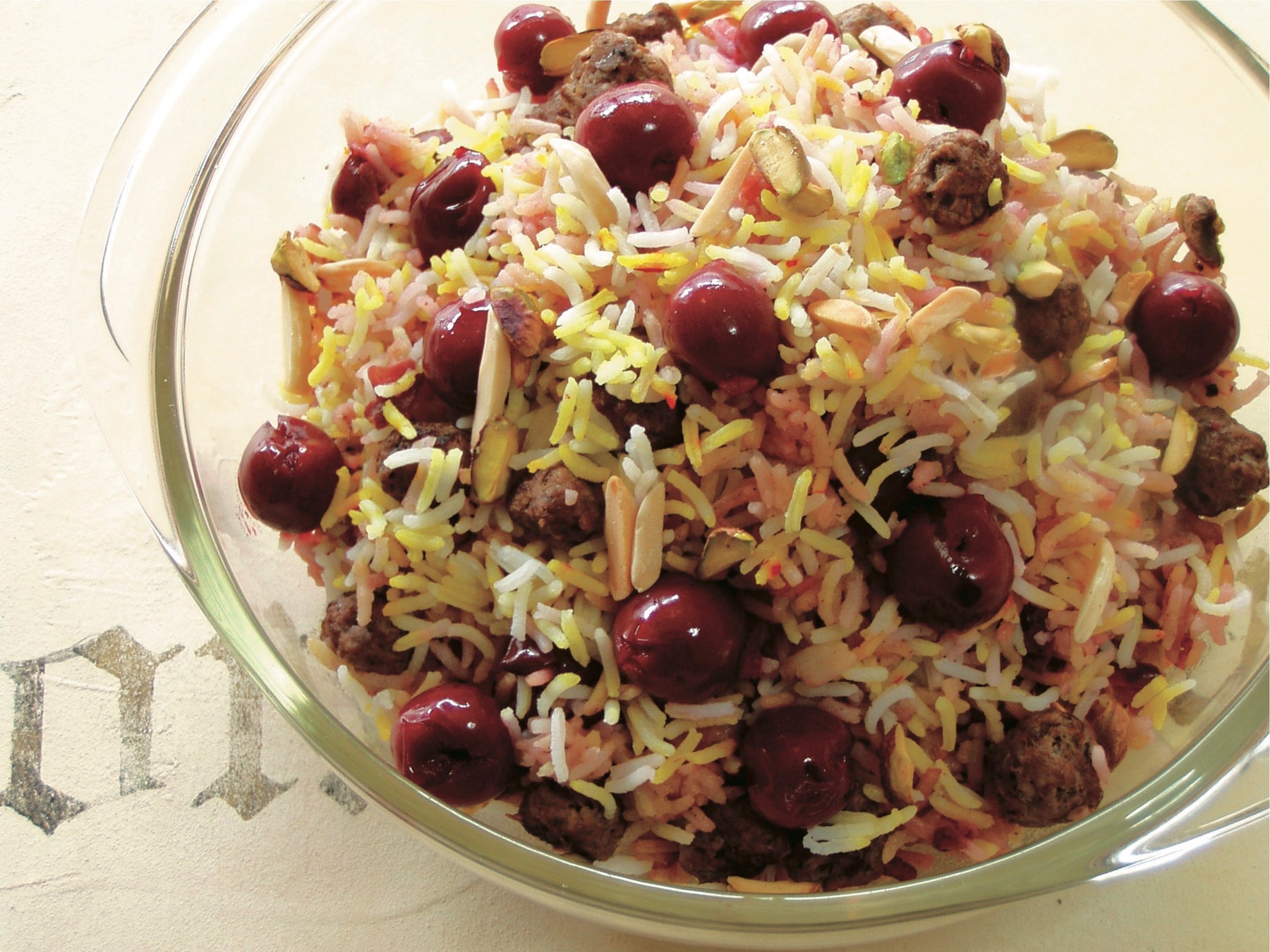ポロとはふわっと軽く炊いたペルシャンライスのこと。イランでは生のダークチェリーの旬の時期にチェリーを甘く煮てから作りますが、本書ではサワーチェリーの瓶詰めで代用。バスティマライスという長粒米があればそちらをぜひ。もちろん日本の短粒米でもおいしく作れます!