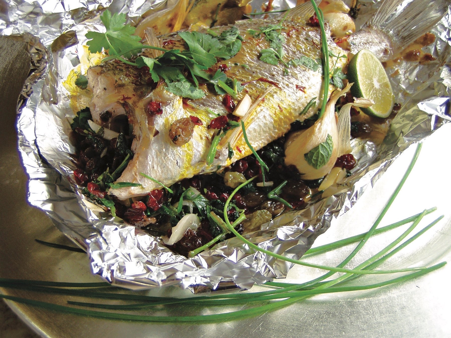 イランの食卓によく登場する赤色の木の実ゼレシュク(バーベリー)というベリーを使った料理です。本書ではドライクランベリーで代替する提案も。ハーブの緑とベリーの赤がきれいな一品です。