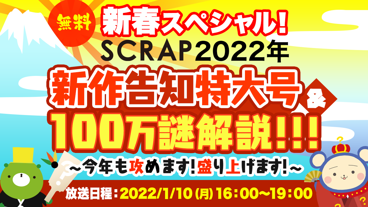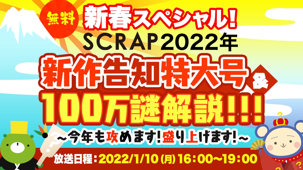 『新春スペシャル! SCRAP2022年新作告知特大号&100万謎解説!!! ~今年も攻めます!盛り上げます!~』は、1月10日(月祝)16:00~19:00に放送する、無料で視聴可能なSCRAPの新作告知生放送。