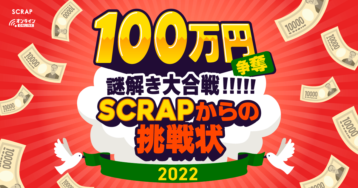 株式会社 SCRAP(所在地:東京都渋谷区、代表者:加藤隆生)は、現在開催中の豪華賞品が当たる無料謎解き企画『100 万円争奪 謎解き大合戦!!!!! SCRAP からの挑戦状2022』(以下『100万謎』)の解説に加え、2022年開催の新作リアル脱出ゲームを一挙に7作品発表する新作告知生放送『新春スペシャル! SCRAP2022年新作告知特大号&100万謎解説!!! ~今年も攻めます!盛り上げます!~』を1月10日(月祝)16:00より放送いたします。