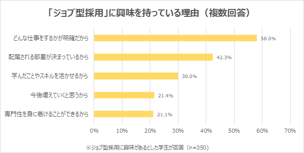 株式会社学情(本社:東京都千代田区)は、2024年3月卒業(修了)予定の大学生・大学院生を対象に、就職活動に関するインターネットアンケートを実施。今回は、「ジョブ型」をテーマに調査しました。「ジョブ型採用」について、「興味がある」と回答した学生が7割に迫りました。「配属ガチャを防ぎたい」「仕事内容が明確だと、ミスマッチも防げると思う」などの声が寄せられています。「ジョブ型採用」に興味を持っている理由は、「どんな仕事をするのか明確だから」が58.0%で最多。「終身雇用」が当たり前でなくなりつつある現在、主体的にキャリアを形成していくことが必要になってきています。「総合職」としてキャリア形成を企業に委ねるのではなく、あらかじめ仕事内容や配属先が明確な「ジョブ型」で主体的にキャリアを描いていきたいという意向が、「ジョブ型」への関心につながっていると推察されます。職種別に、具体的な仕事を体験できる「ジョブ型」のインターンシップがあれば「参加したい」と回答した学生が7割を超えました。