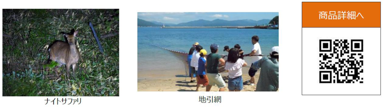 (1)商品名:ガイドと一緒に三陸の海の生き物・山の生き物について学ぼう!夜の町で野生動物を観察「大槌ナイトサファリ」とみんなで力を合わせて「地引網体験」