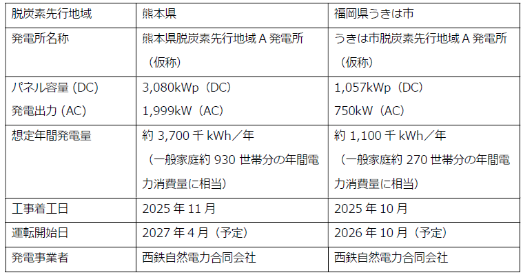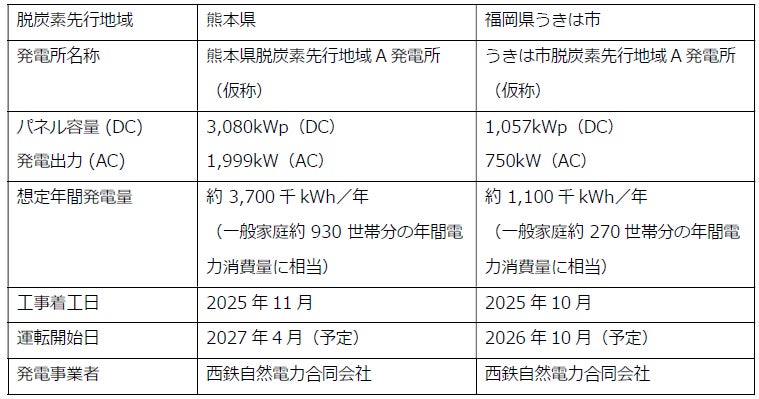 西鉄自然電力は、熊本県や福岡県うきは市と環境省の第4回脱炭素先行地域に共同提案し、2023年11月に選定されるなど、地域の脱炭素化に向けた取り組みを加速しています。太陽光発電所の建設は順調に進行中で、運転開始は熊本県で2027年4月、福岡県で2026年10月を予定しています。脱炭素先⾏地域への再生可能エネルギーの供給を通じて、地域の課題解決に主体的に関与することで、九州エリアの脱炭素化や再⽣可能エネルギーを起点とした地域振興に取り組んでまいります。