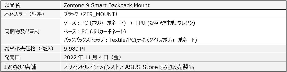 また、Zenfone 9用の別売りアクセサリー製品として、便利なアクセサリー3点をセットにした「Zenfone 9 Connex Accessories Set」と、バックパックなどのショルダーストラップにZenfone 9を取り付けられる「Zenfone 9 Smart Backpack Mount」を合わせて発表いたしました。Zenfone 9及び別売りアクセサリー、全製品2022年11月4日(金)より販売を開始いたします。