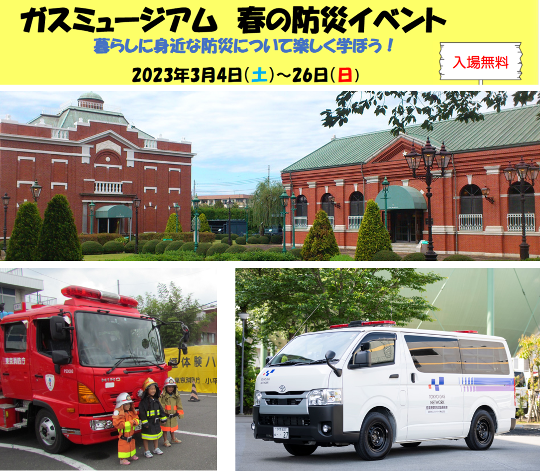 ガスミュージアムでは、2023年3月4日(土)から3月26日(日)まで、恒例の春の防災イベントを4年ぶりに開催します。お子さまから大人まで楽しみながら防災について学べるイベントです。ぜひお越しください。https://www.gasmuseum.jp/