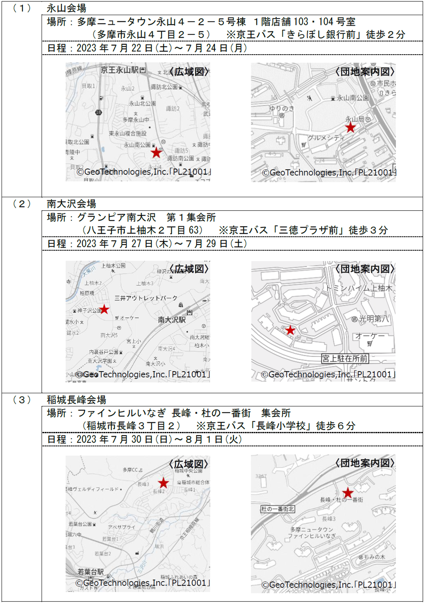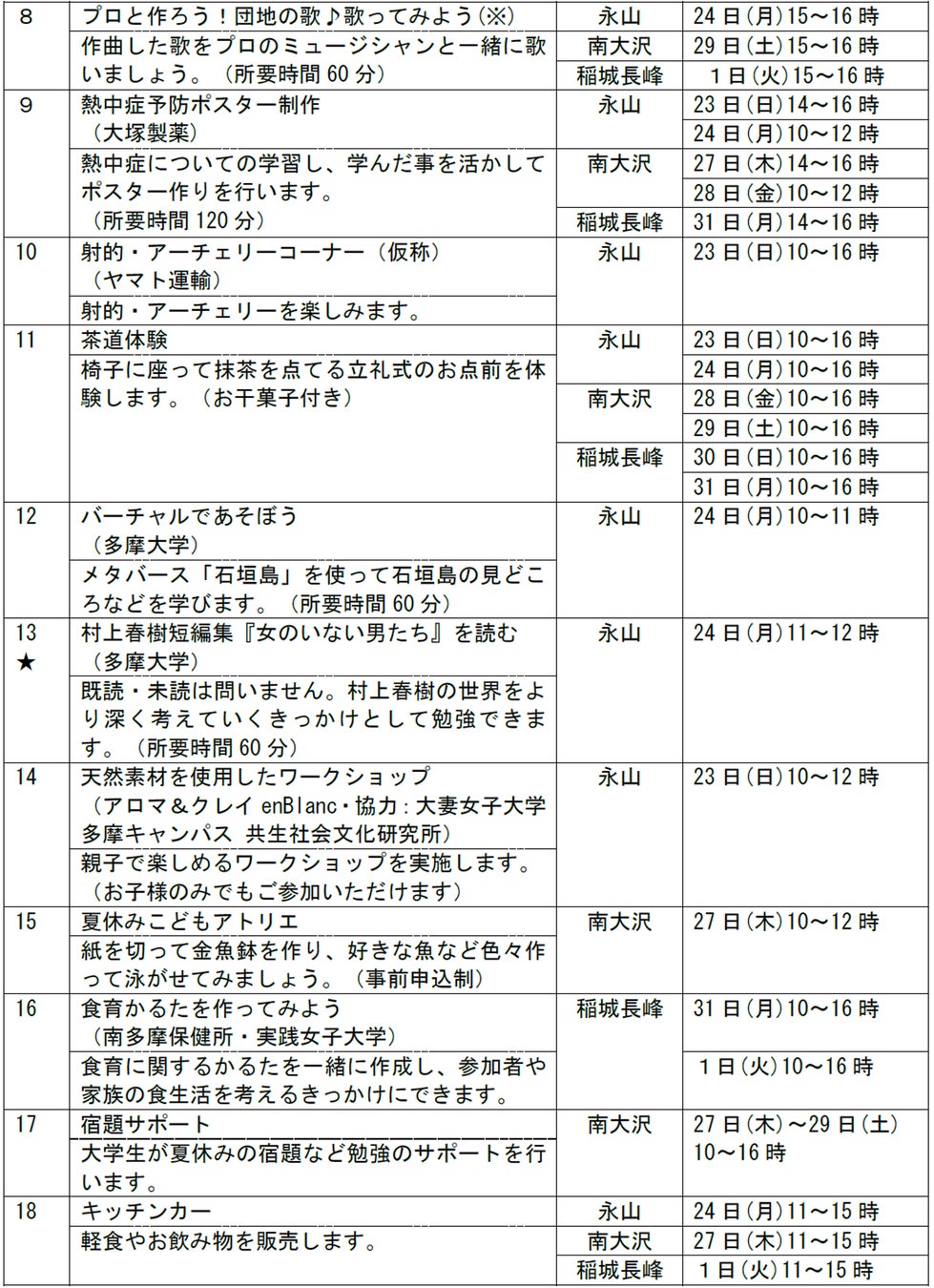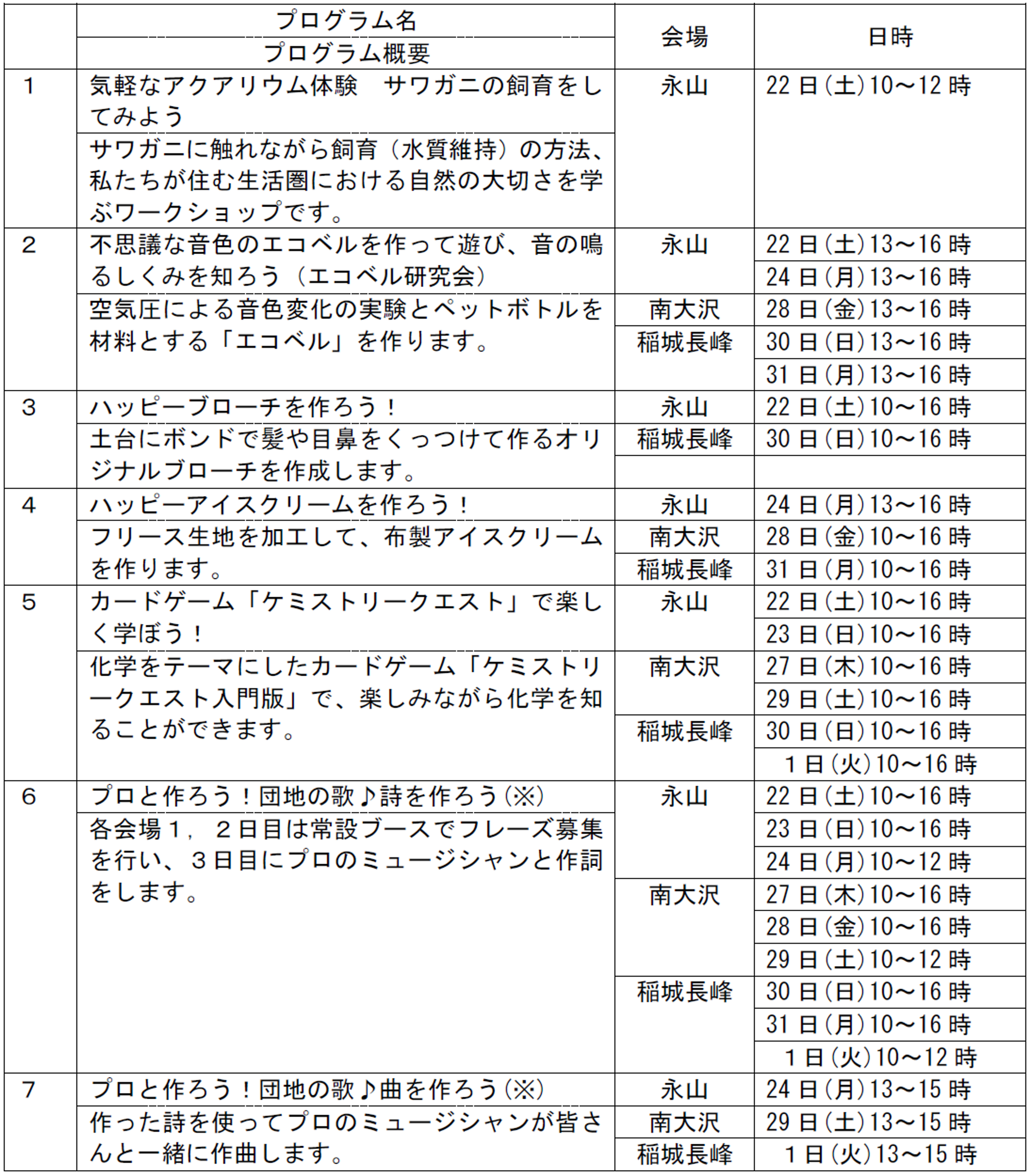 多摩エリアで活躍するミュージシャン・川久保秀一氏らによる多摩ニュータウンの団地をテーマにした歌作りや、大塚製薬による熱中症予防のワークショップ、南多摩保健所・実践女子大学による食育、多摩大学の講師によるメタバースの講義のほか、地域有志による各種コンテンツを予定しています。(各会場によって講座内容は異なります)