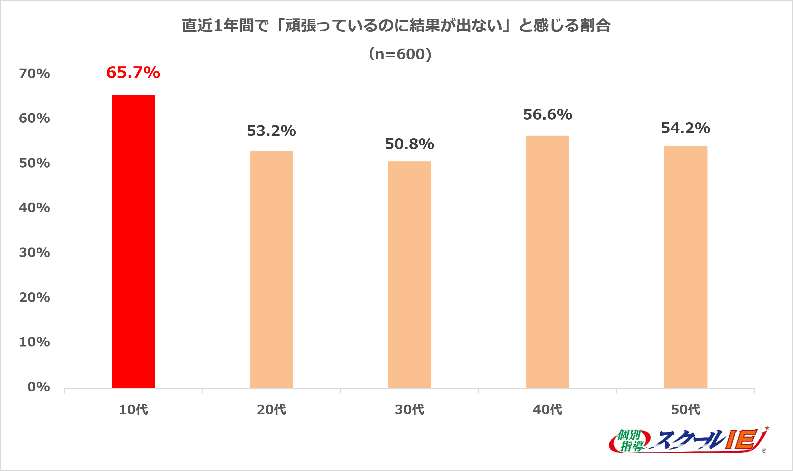 全体の54.9%が「この1年で頑張っているのに結果が出ない」と回答。10代ではその割合が65.7%にのぼり、若年層の“努力迷子”傾向が特に強く見られた。 -