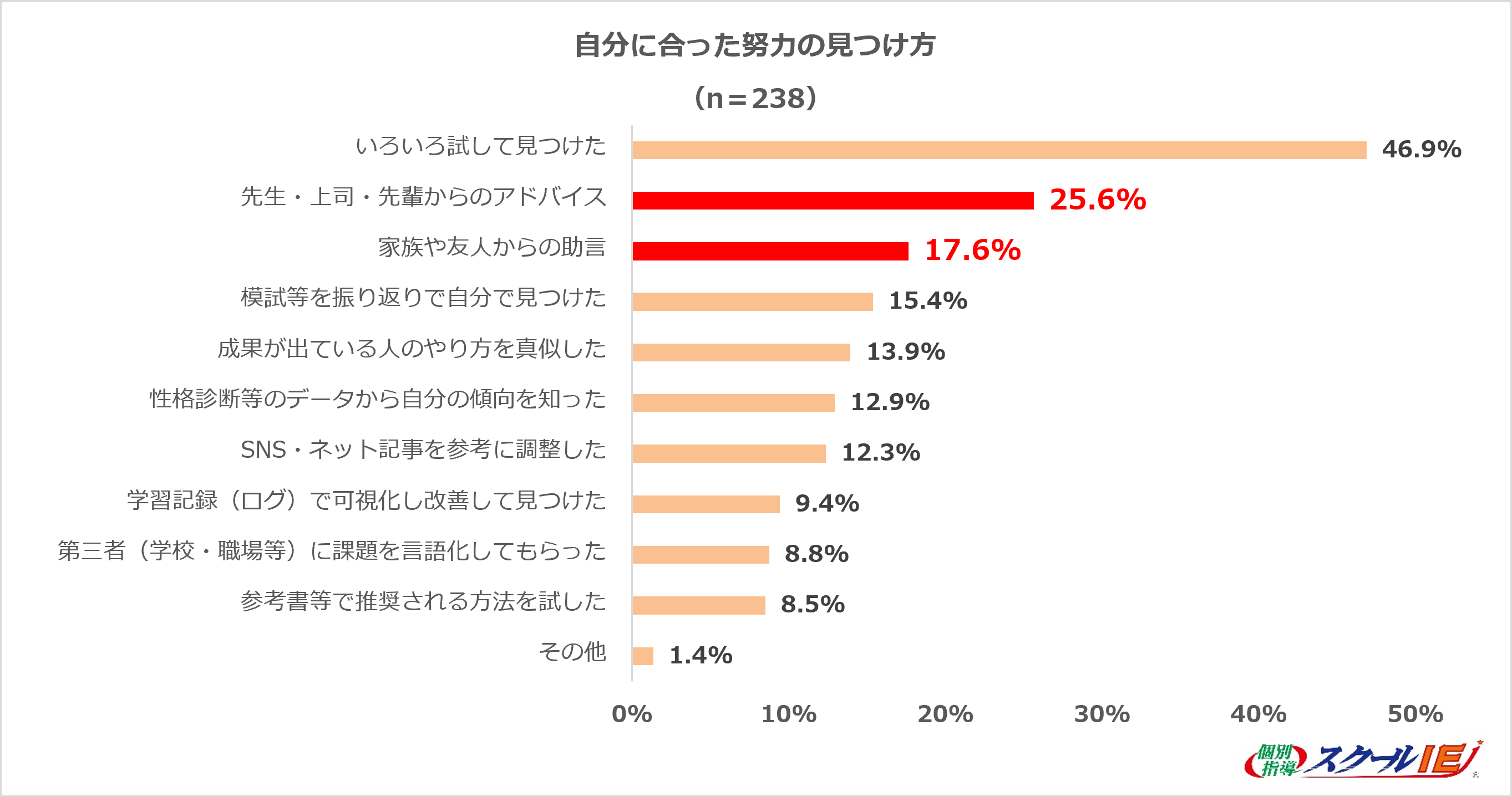 自分に合った努力の仕方を「見つけている」「おおよそ見つけている」と回答した人に対して、その見つけ方を尋ねたところ、「いろいろ試して見つけた(46.9%)」が最も多く、次いで「先生・上司・先輩からのアドバイス(25.6%)」、「家族・友人からの助言(17.6%)」が続き、自分に合った努力は、試行錯誤や周囲からのサポートによって見つけていることが分かりました。