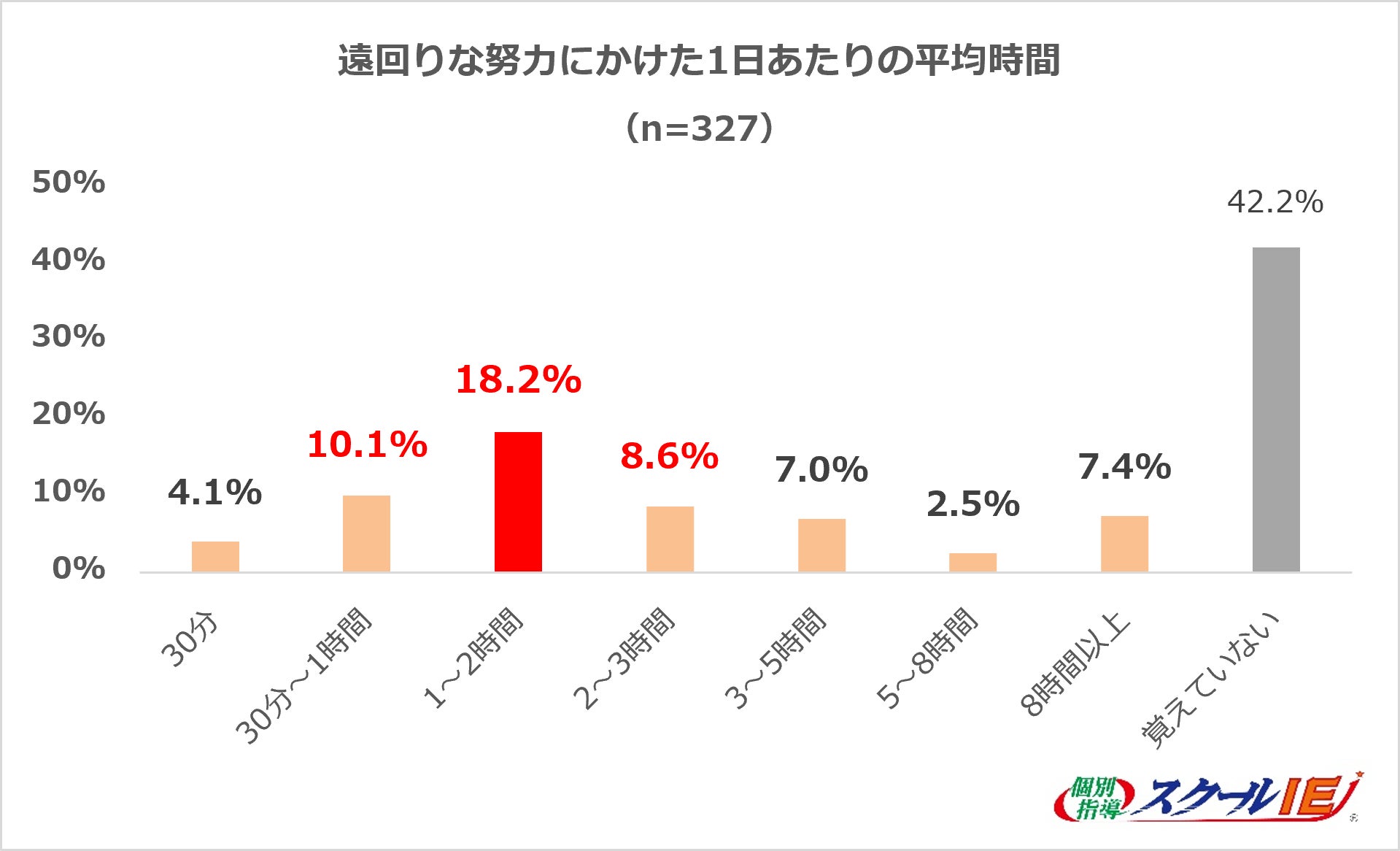 自分に合わない頑張りや遠回りな努力をした経験について聞いたところ、全体の54.4%が「経験あり」と回答。さらに、その遠回りにかけた期間については、「1年以上」が29.1%で最も多く、期間中に1日あたり費やしていた時間としては、「1~2時間(18.2%)」「30分~1時間(10.1%)」「2~3時間(8.6%)」が上位を占める結果に。仮に、毎日2時間×1年間取り組んだ場合、累計730時間(約30日分)は、遠回りな努力に時間を費やしていたことが明らかになりました。