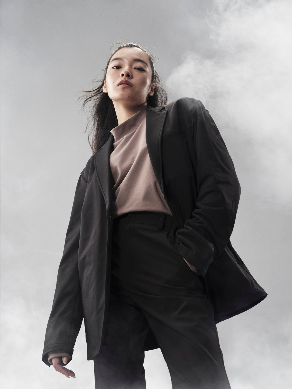 生地表面はハリ感があり美しいドレープが出る素材でありながら、裏面はスウェットの裏毛のようなやわらかい肌触り。伸縮性に優れていながら、糸自体の構造により膝抜けなどの型崩れが起きにくいのが特長です。やや厚みのある素材なので、パンツのガゼット仕様やジャケットのアームホールなど重なりのある部分をすっきり見せるため、定番シルエットもパターンを改良し、リラックスしたカジュアルな着心地ながらスタイリッシュな見た目を実現。カジュアルにもビジネスにも合う服ができあがりました。「MET24」定番ラインのパンツとジャケットのセットアップに加え、フーディ、モックネックやジョガーパンツなどにも採用しています。