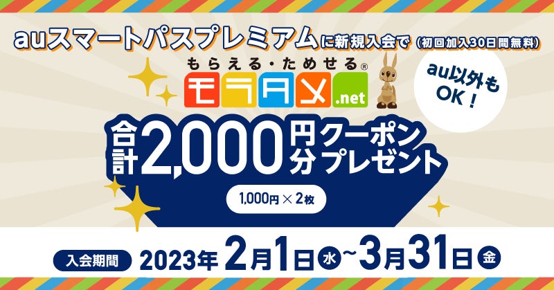 - 概要:日本最大級の商品お試しサイト「モラタメ」経由または本キャンペーンページより「auスマートパスプレミアム」に新規入会された方を対象に、「モラタメ」で使える入会特典クーポンを、総額2,000円分プレゼントします。