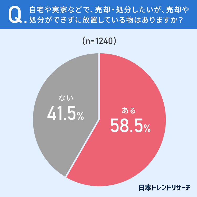 58.5%と半数以上の方が、自宅や実家などで、売却・処分したいが、売却や処分ができずに放置している物が「ある」と回答しています。