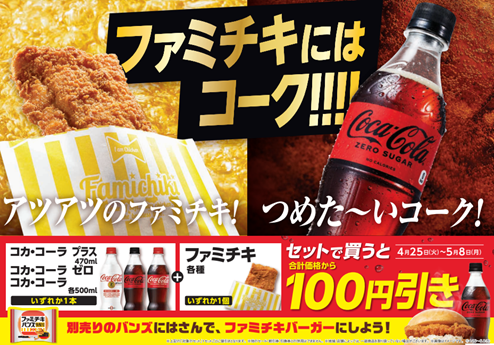 ファミチキにはコーク!!!!ファミチキと「コカ・コーラ」をセットで買うと100円引きになるキャンペーンを4月25日(火)より開催!~同日より、ファミチキ(柚子こしょう)も発売~
