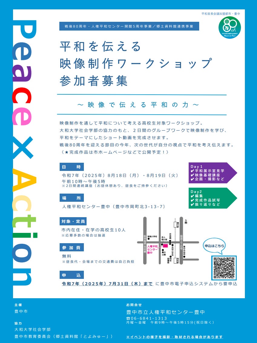 この事業では、生徒たちが平和展示室を見学したのち、大和大学社会学部(吹田市)の協力のもと、平和をテーマにした動画の企画・撮影・編集を行います。完成した動画は、今後の平和啓発事業で活用します。高校生が平和について主体的に考え、表現することで、戦争の記憶を風化させることなく次の世代へと平和の思いをつなげていく契機とします。