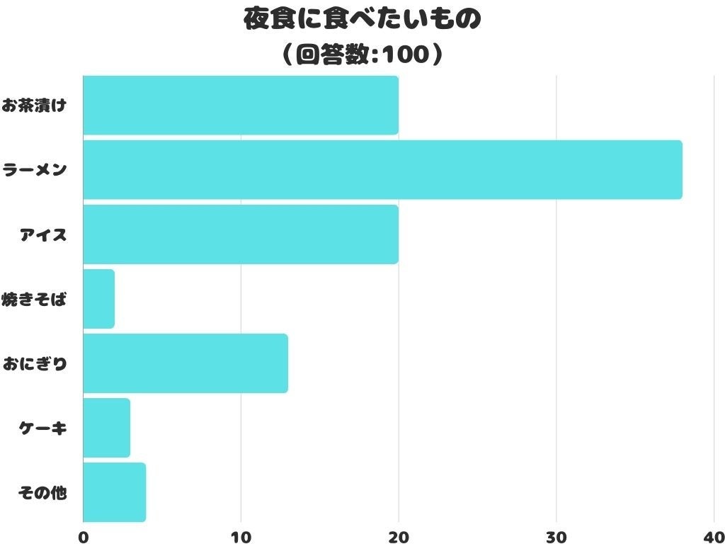 夜食に食べたいものをアンケートにて調査したところ、1位は「ラーメン」でした。