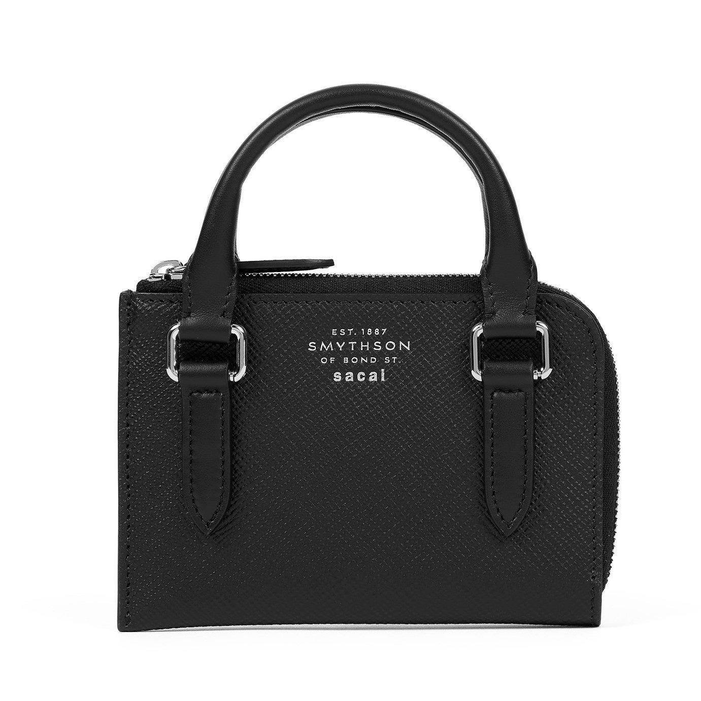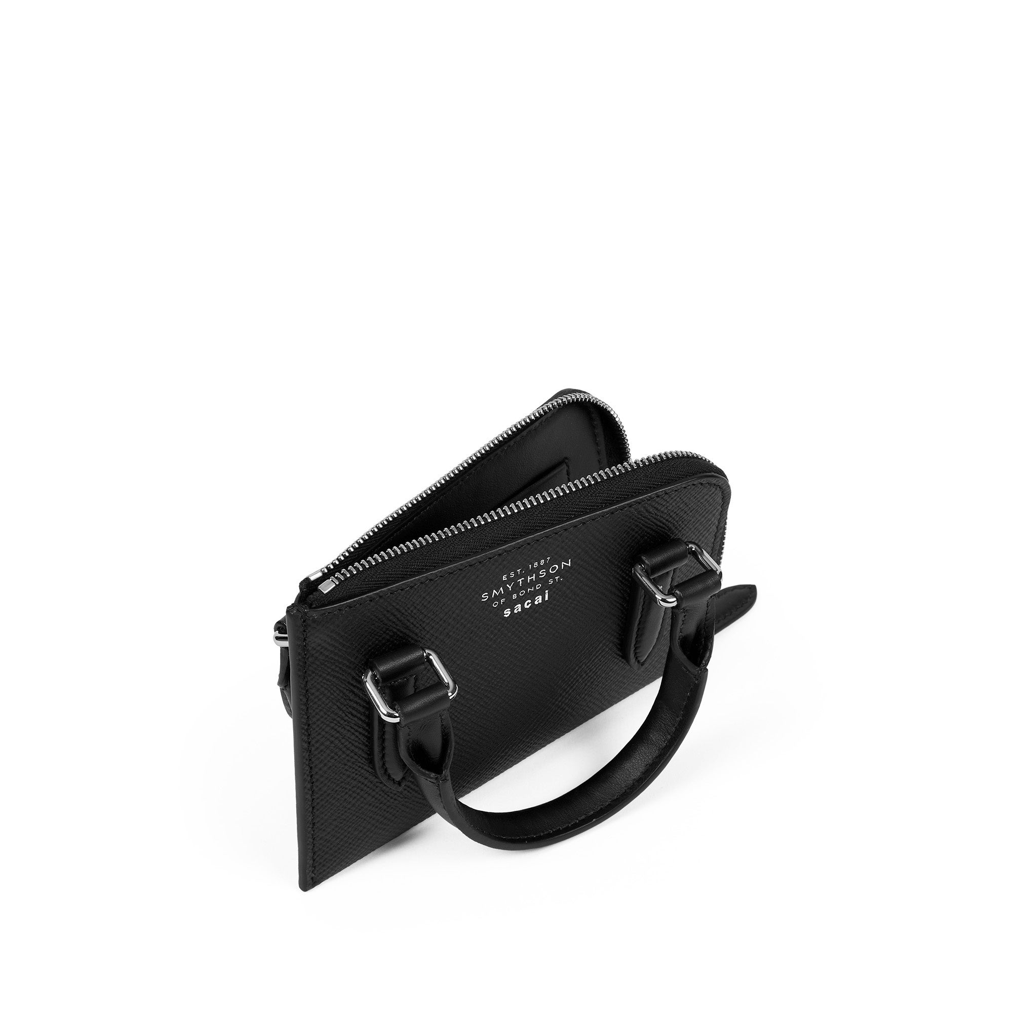 コラボレーションでは、sacai がクリエイティブプロセスの中核を担い、Smythson を象徴する3つのアイテム : パスポートカバー、ポーチ、チェルシーノートブックを展開。すべて Smythson のシグネチャーであるブラックのクロスグレイン加工を施したパナマレザーを使用しています。各アイテムには、Smythson の歴史あるブリーフケースやラゲージから着想を得た、ミニマルで構築的なハンドルをあしらい、クラシックなデザインに意外性のある再解釈を加えることで、sacai ならではのアイデンティティを表現しています。