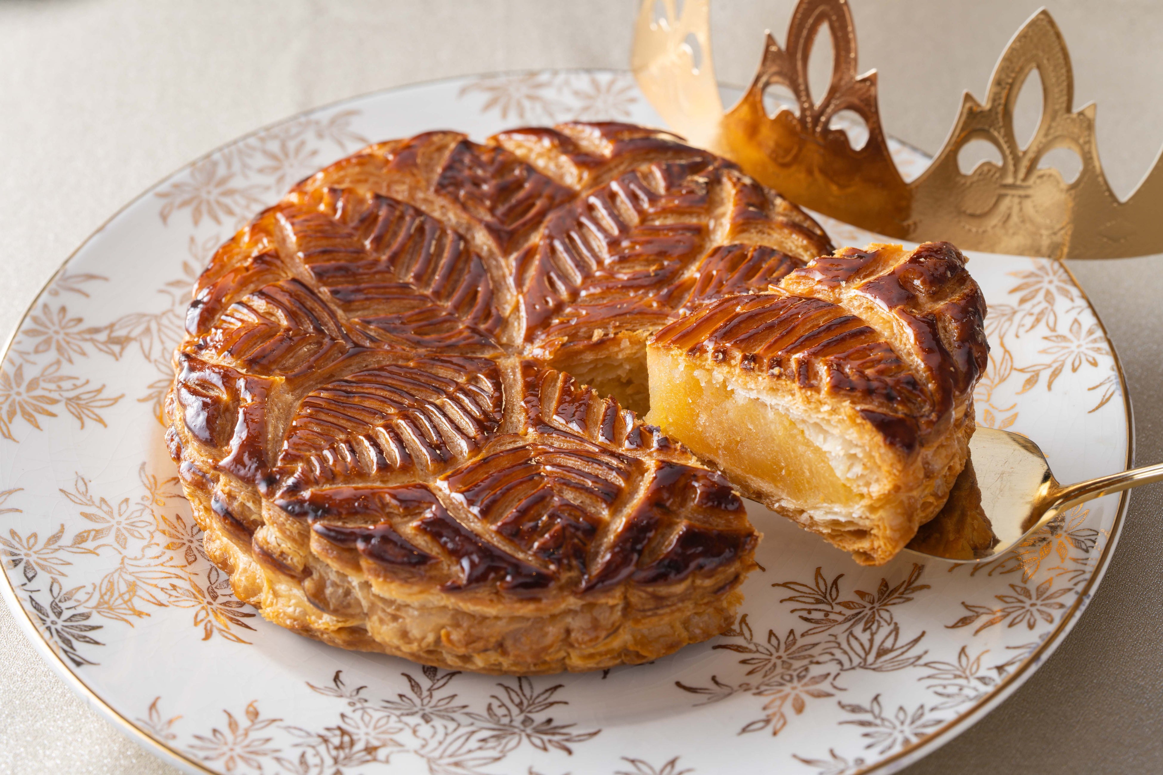 フランスでは年が明けるといっせいにお菓子屋さんやパン屋さんにならぶほど新年にかかせない伝統菓子です。アーモンドの優しい甘さとコクのある生地「クレームダマンド」をサクサクのパイ生地で包み焼きあげた焼き菓子で、中には「フェーヴ」とよばれる陶器製のチャームがひとつ入っています。切り分けてそれが当たった人は、その一年幸運に恵まれると言われています。