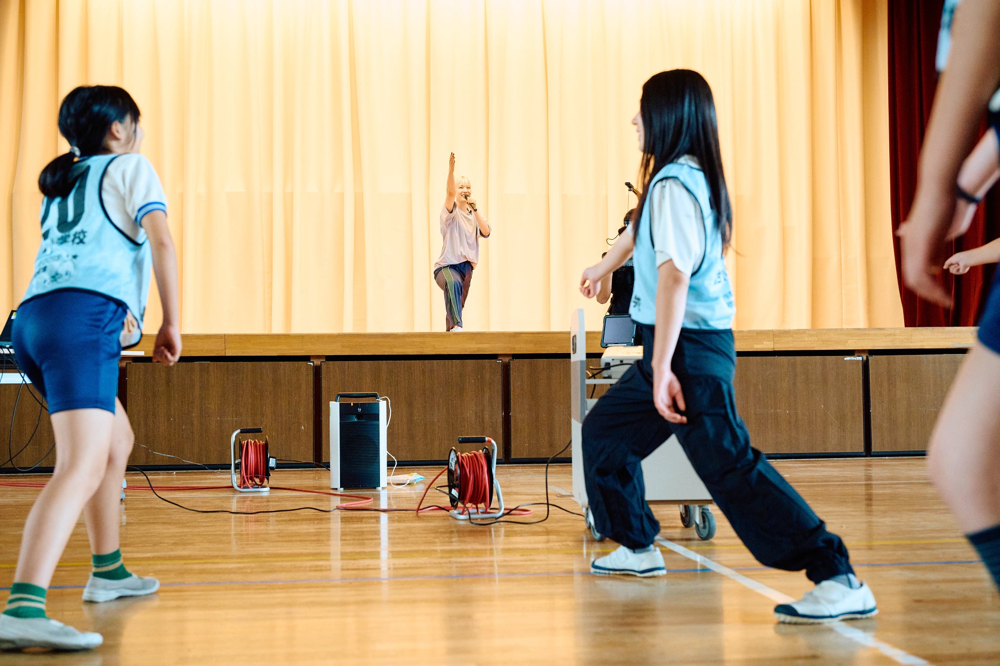 江村美咲選手がステージ上でフットワークの見本を見せると、機敏な動きに児童たちは感嘆の声を上げていました。児童にとっては初めての体験で、特徴的なフットワークの動きに最初は苦戦した様子でしたが徐々にコツを掴み楽しみながらフェンシングの掛け声を発声しながら元気に参加していました。