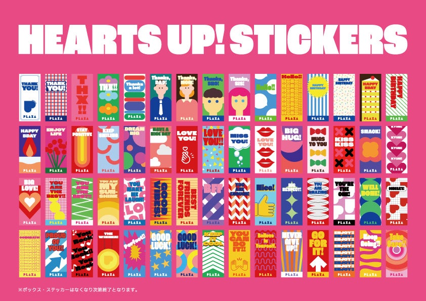 ギフトボックスは2種類のピンクで各4サイズをご用意。全60種のオリジナルステッカーには、ポップなカラーリングで“THANK YOU!”、“LOVE YOU!”、“GOOD LUCK!”などのさまざまなメッセージとユニークなモチーフをデザインしています。