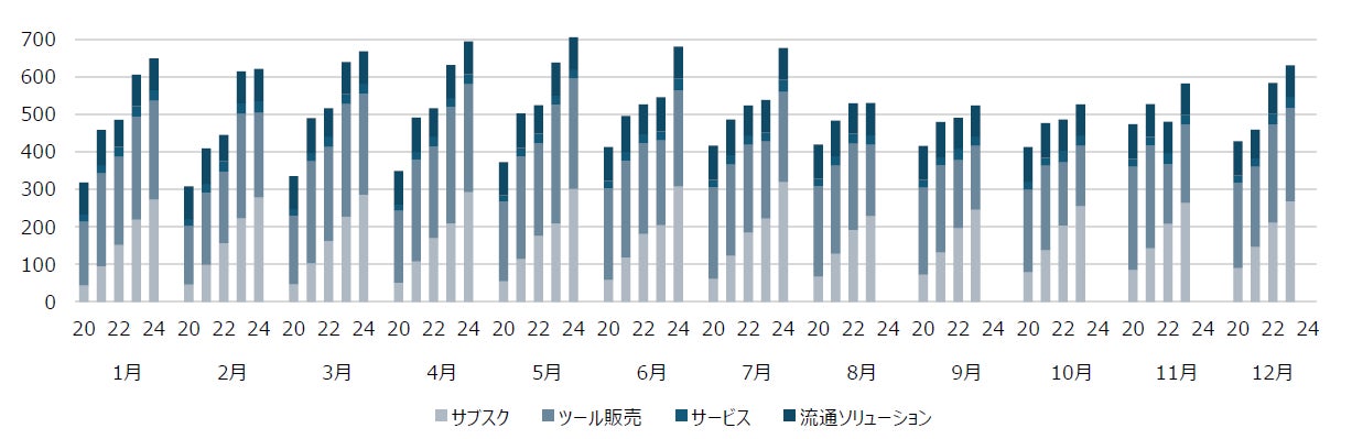 グループ内の内部売上も含まれていることや計算過程で百万円以下を切り捨てていること等から、連結業績や他の指標とは差異が生じます。サブスクリプションは、CLIP STUDIO PAINT サブスクリプション売上です。ツール販売には、一括支払いモデルのダウンロード版や法人向けライセンスの売上などが含まれます。サービスには、CLIP STUDIO WEBサービスでの売上などが含まれます。流通ソリューションには、電子書籍に関連する売上などが含まれます。
