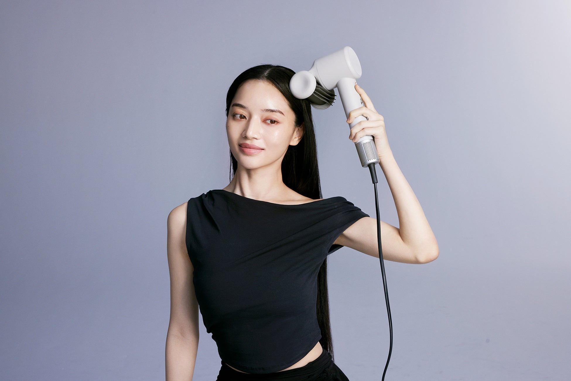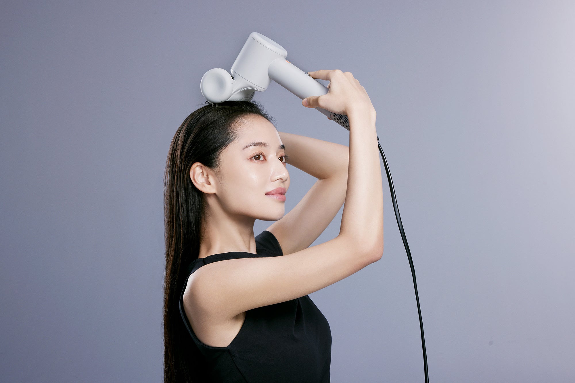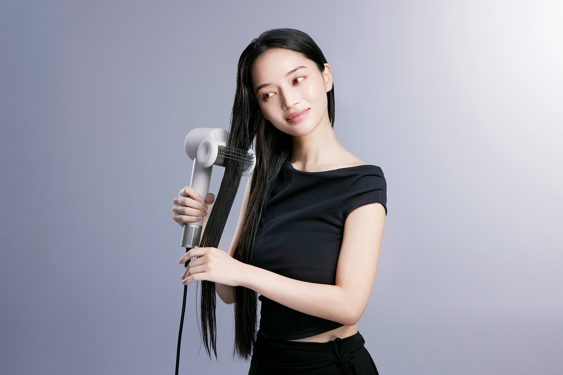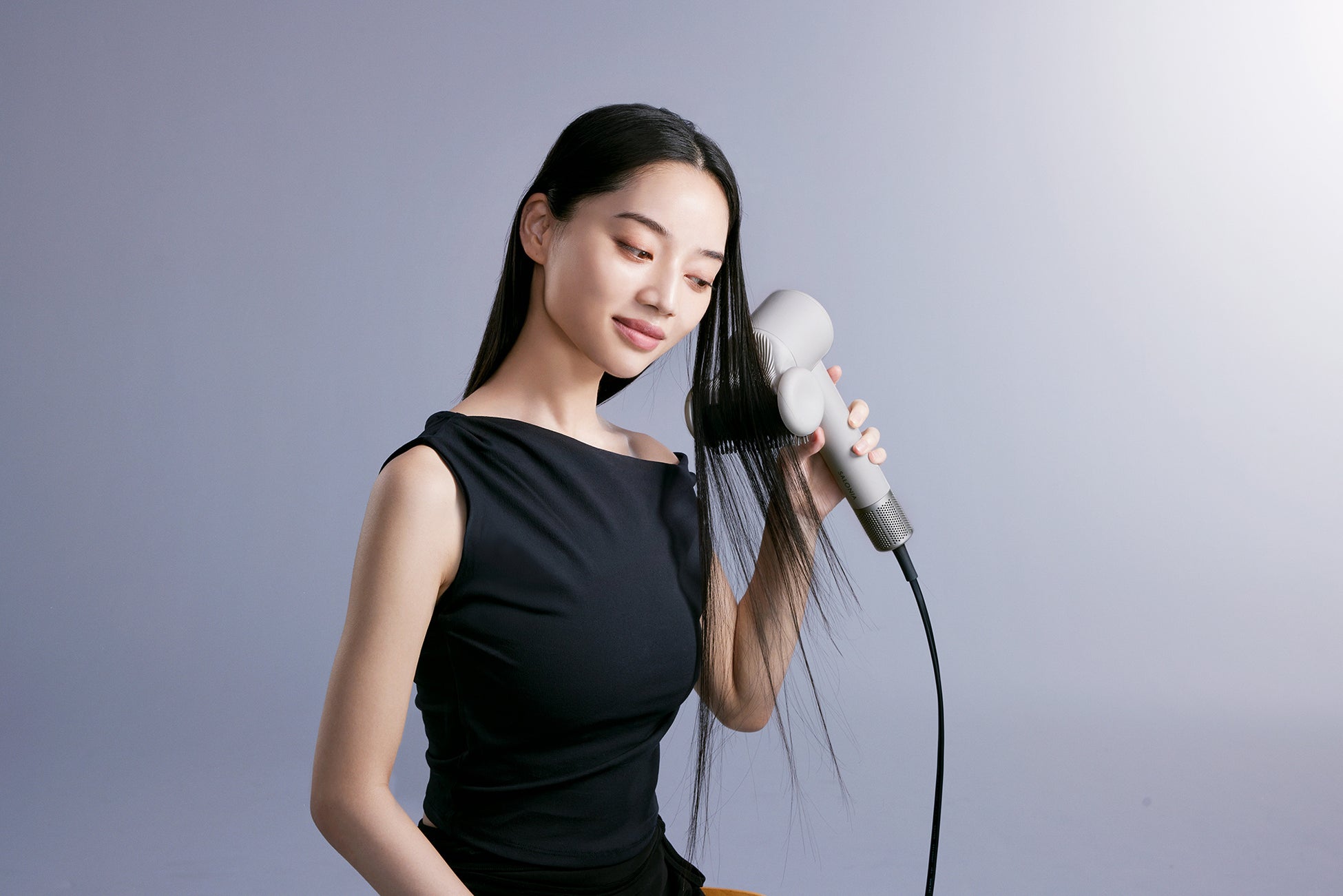 髪を風の力で吸いつけ浮き毛を髪の内側に抑えることで、滑らかでツヤのある仕上がりに整えます。