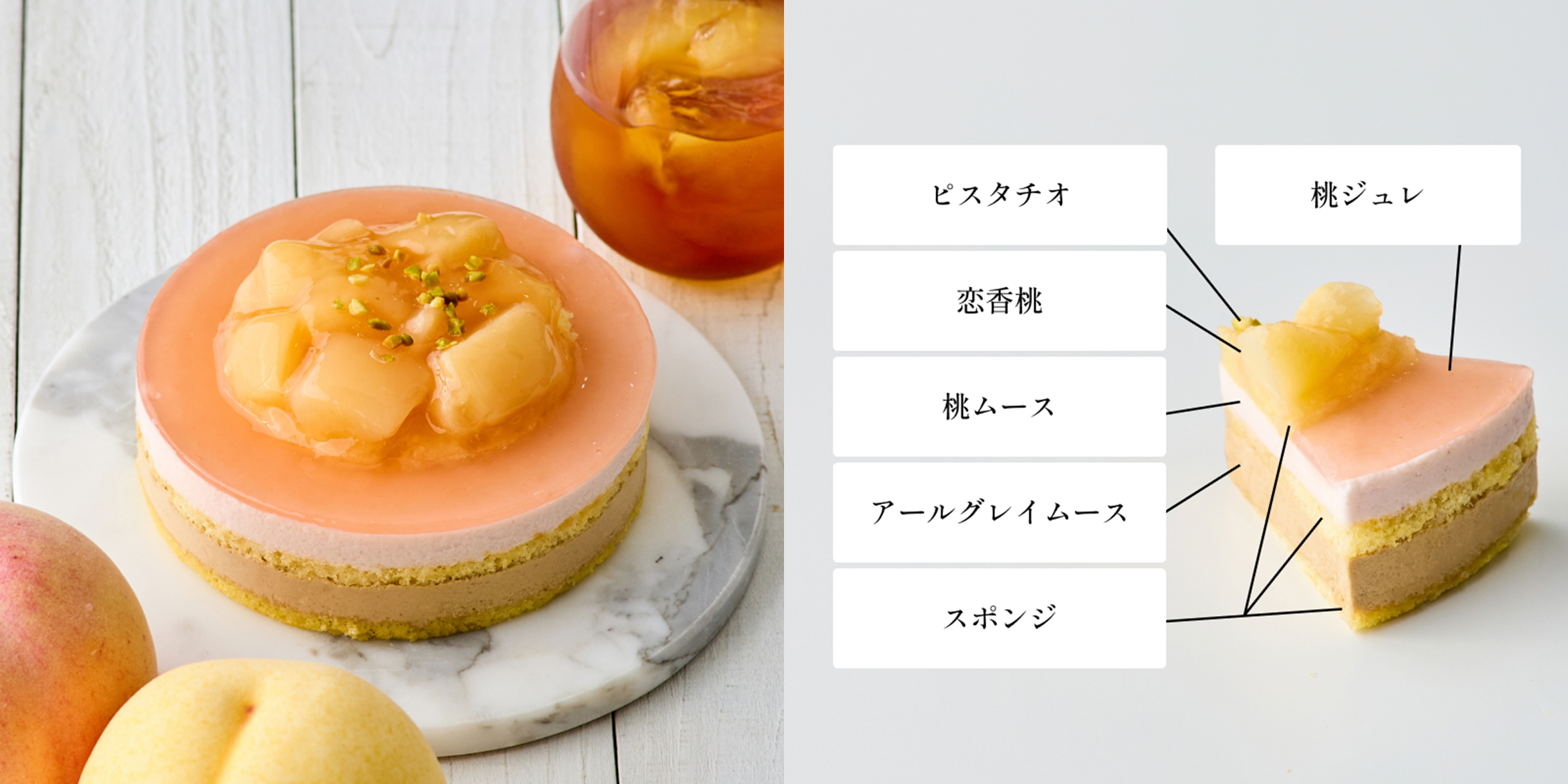 桃の爽やかな甘さと、香り高い紅茶の味わいが調和したムースケーキです。
