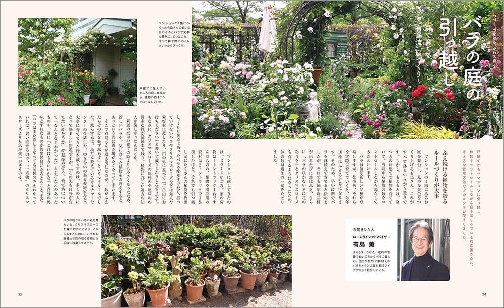庭ルポでは「バラの庭の引っ越し」「家の庭木の譲り方」「地域に残す家の庭」「庭の仕事の頼み方」「みんなで育てる庭」など生涯にわたりガーデニングを楽しむためのヒントや愛する庭を次世代に引き継ぐための事例を具体的に紹介しています。