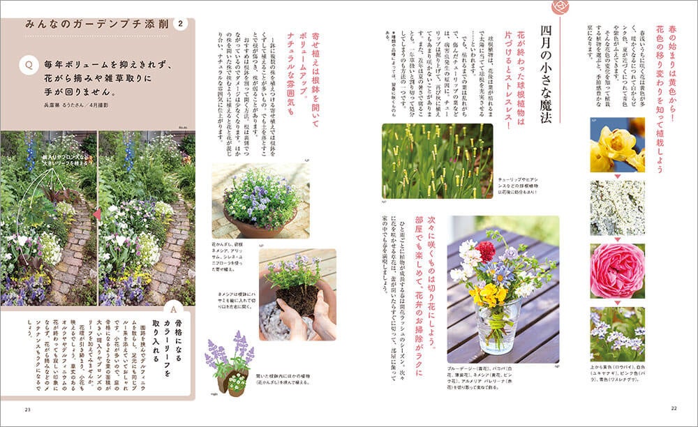 本書では、「庭ごよみ、庭しごと 十二か月」として、これからの「庭ぐらし」のための魔法のヒントを12か月の作業別に紹介。「3月の庭はスカスカくらいがちょうどいい」「バラの花がら摘み、週末にまとめて」「一年草を抜き取るときも、ついで仕事を考えよう」など、美しい庭が無理なく続けられる小さなヒントをたくさん用意しました。