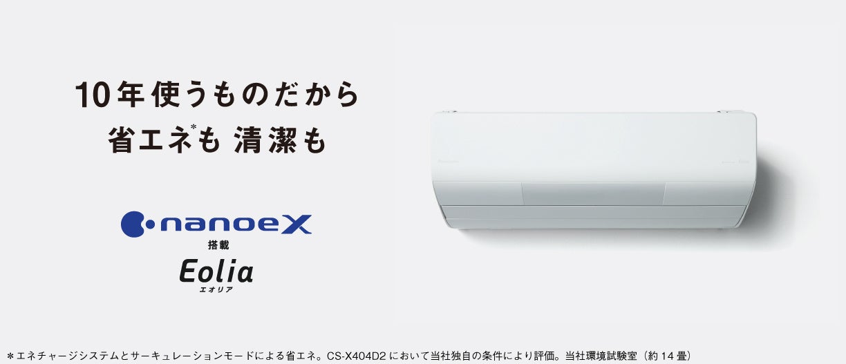 パナソニック エオリア(Xシリーズ)は昨今の生活者のニーズに合わせ、独自の技術で快適性はもちろん、省エネ性(※1)やエアコン内部と室内の空気の清潔性を実現。パナソニックは、長く使う家電だからこそ、お客様に安心してお使いいただきたいという想いを新しいコンセプト「10年使うものだから」に込め、商品をお届けします。