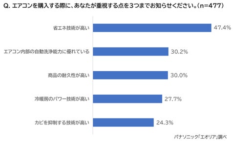 一般的にエアコンの平均使用年数は10年以上(※2)と言われており、長い期間使用される家電の一つです。さらに、パナソニックがエアコンの購入意向者に対し「購入時の重視点」を調査したところ、「1位:省エネ技術が高い」「2位:エアコン内部の自動洗浄能力に優れている」「3位:商品の耐久性が高い」という結果でした。