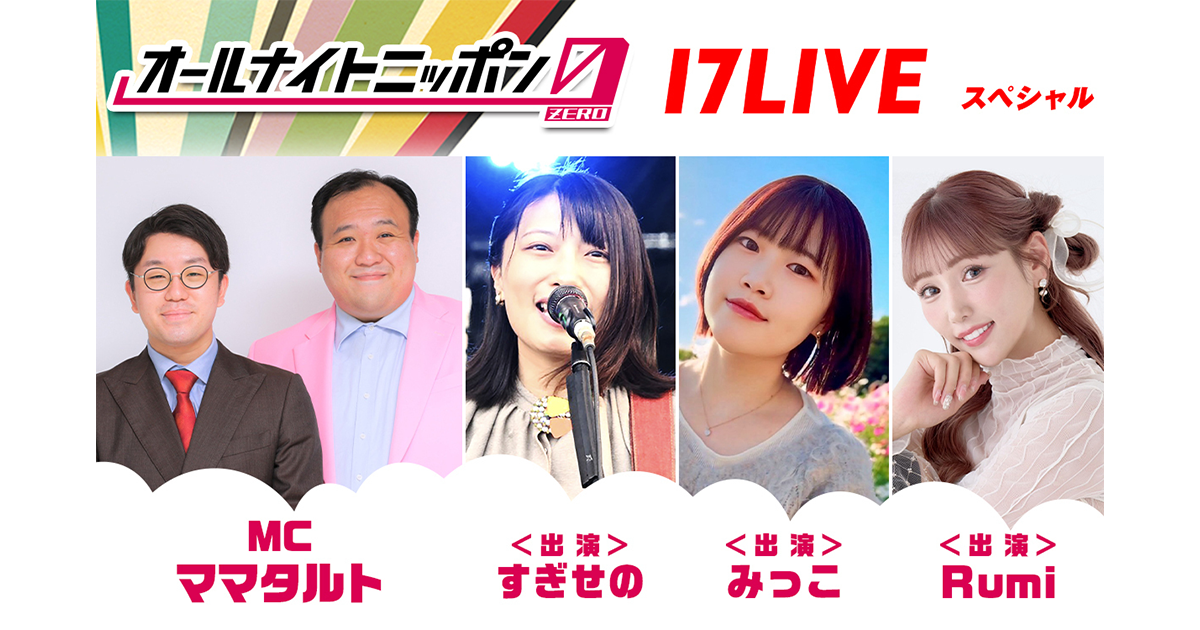 3月21日(土)に放送される「オールナイトニッポン0(ZERO)~17LIVE SP~」では、2年連続M-1グランプリファイナリストで当日パーソナリティを務める人気お笑いコンビ・ママタルトのお二人の軽妙なMCをベースに、3名のライバーがパフォーマンスおよびさまざまなテーマでトークを繰り広げる予定です。