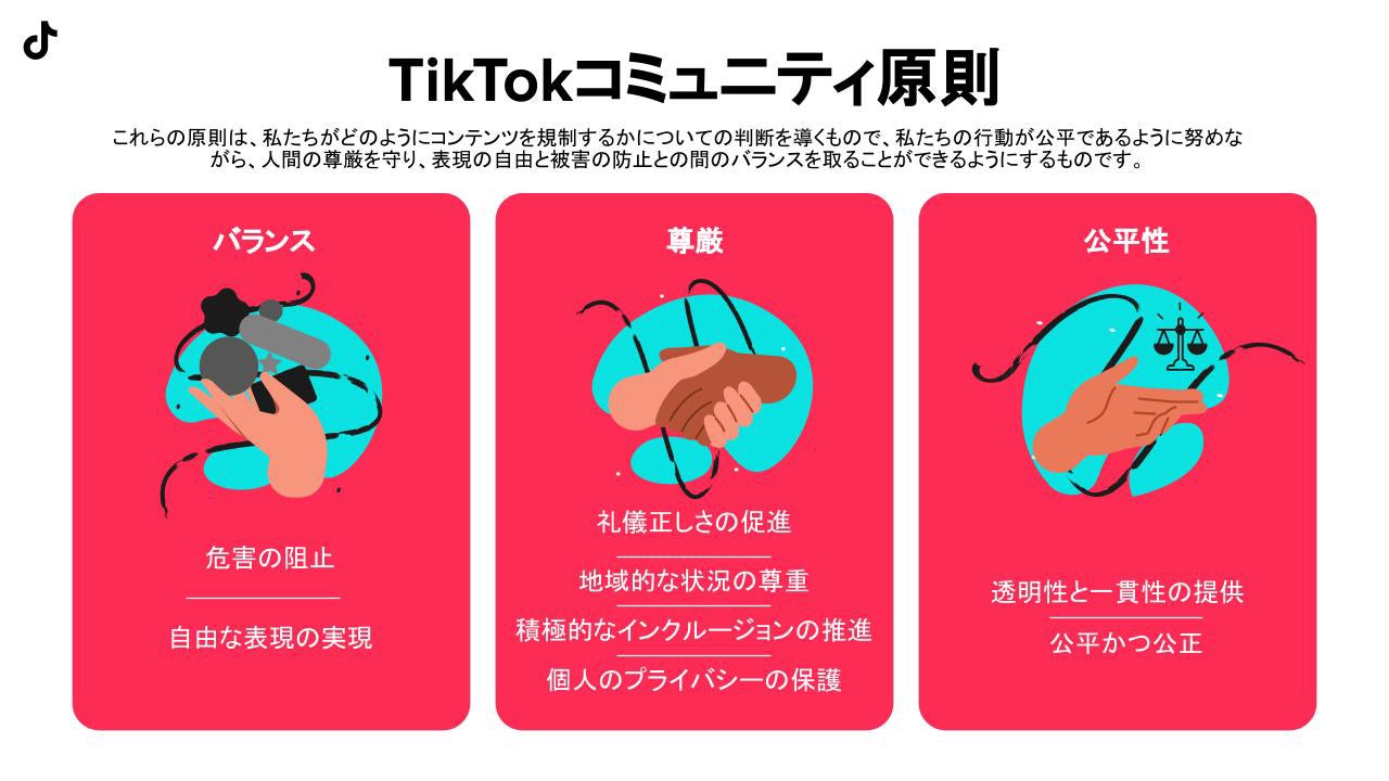 コミュニティガイドライン更新の一環として、TikTokの安全性を保ち、信頼を築くためにどのような基準で判断し、取り組んでいるかを理解してもらうために、「TikTokコミュニティ原則」(https://www.tiktok.com/community-guidelines/ja-jp/community-principles/?cgversion=2023 )を初めて皆さまに共有します。これらの原則は、人権擁護への取り組みに基づいており、国際的な法的枠組みにも沿っています。