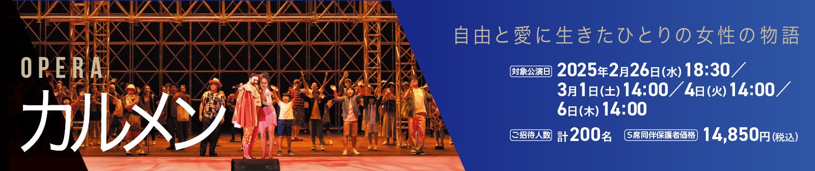 新国立劇場では2025年2月~3月に上演予定のオペラ『カルメン』に計200名のお子様(公演当日に小学生~18歳以下)を無料でご招待いたします。また、保護者等が同伴される場合は、半額でS席をお買い求めいただけます(先着順・席数に上限あり)。ぜひこの機会にお申込みください。