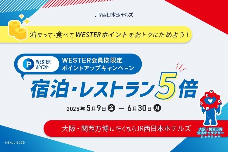 株式会社ジェイアール西日本ホテル開発(京都府京都市下京区、代表取締役社長 伊勢正文)は、JR西日本ホテルズ全13ホテルにて、WESTERポイントの付与が通常の5倍になる「WESTERポイント5倍キャンペーン」を、2025年5月9日(金)から6月30日(月)まで実施します。