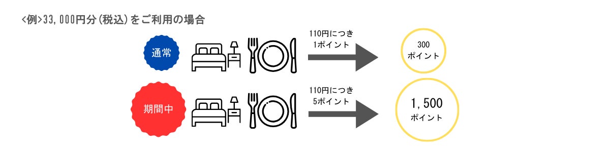 ご利用料金110 円(消費税・サービス料込)につきWESTER ポイント1 ポイントを付与しているところ、期間中は対象宿泊プランやレストラン・バー、ホテルショップなどのご利用で5 倍となる5 ポイントを付与。(即日付与)