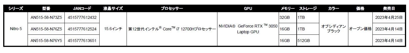 「AN515-58-N76Z5」「AN515-58-N76Y5」は2023年4月14日(金)に発売し、「AN515-58-N76Z5」はAmazonにて、「AN515-58-N76Y5」はビックカメラグループ、ヨドバシカメラ、Joshin、ZOAのそれぞれのECサイト※にて販売します。「AN515-58-N73Z5」は2023年4月25日(火)に発売し、Acer公式オンラインストアにて販売します。