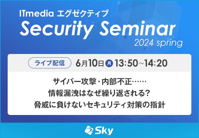Sky株式会社は、6月10日(月)~6月11日(火)に開催される、ITmedia主催のライブ配信セミナー「ITmedia エグゼクティブ セキュリティセミナー 2024 春 DXに走る日本企業 ──サイバーセキュリティの強化が経営の最重要課題に」に協賛いたします。