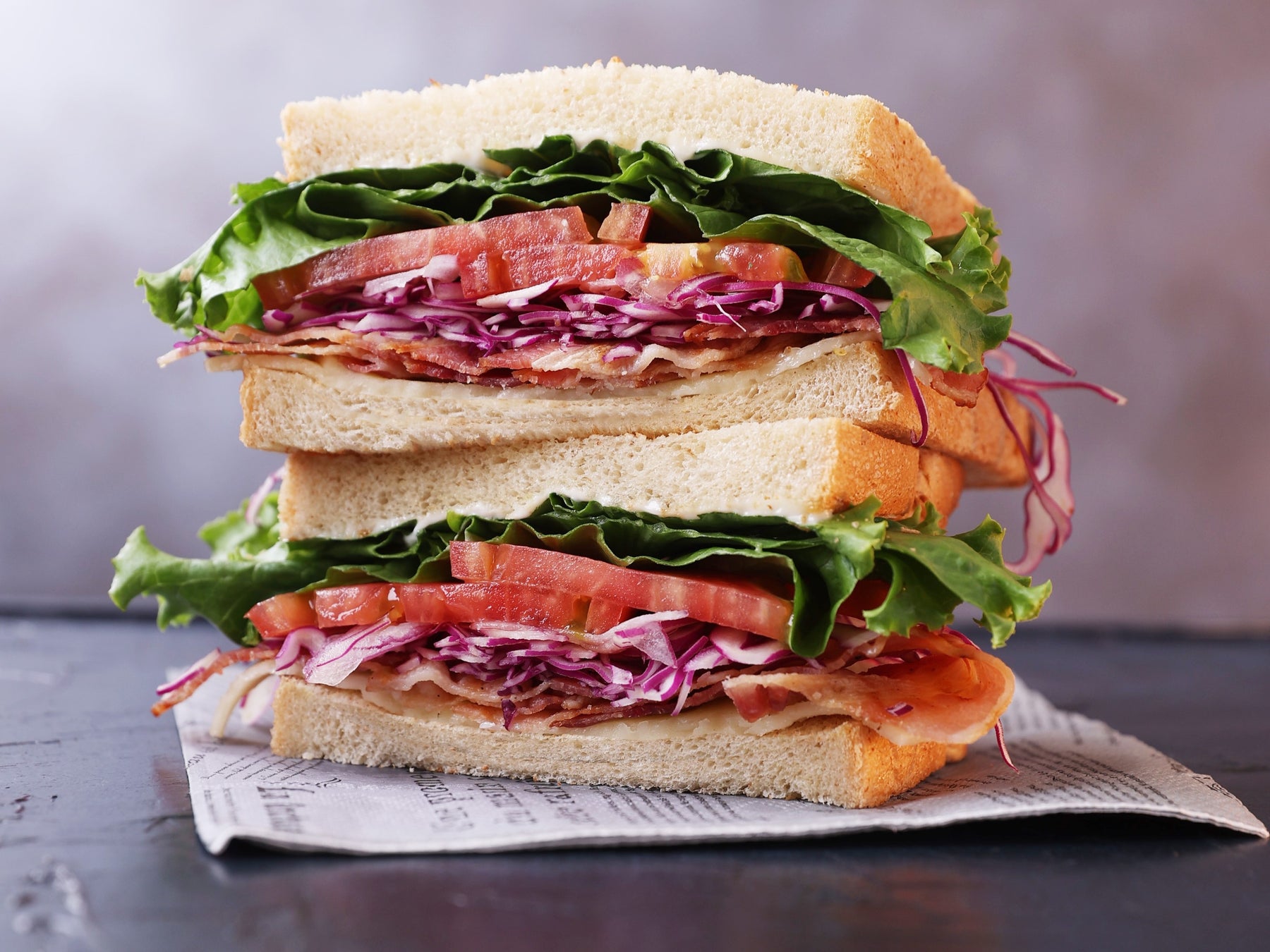 「スモーク モントレージャックチーズ」、ベーコンを3枚重ね、スモークしたマヨネーズとブラックペッパーを合わせました。さらにパープルキャベツ、パープルオニオン、みずみずしいトマトとグリーンリーフを重ねた贅沢サンドウィッチ。