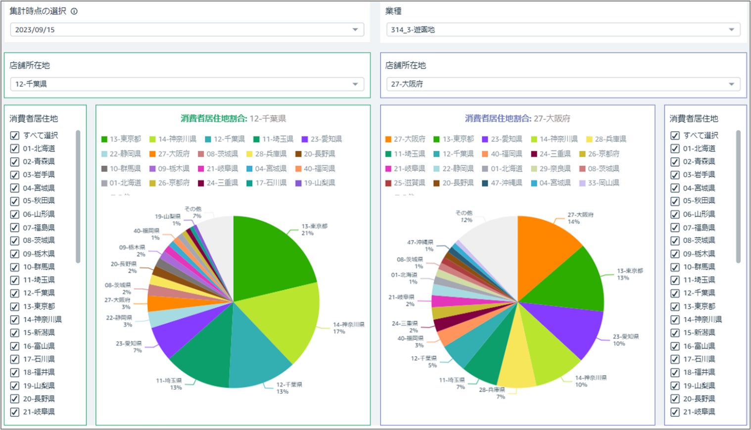 2023年9月15日時点での「遊園地」消費における消費者の居住地割合を、大阪府所在店舗と千葉県所在店舗とで比較。どちらも全国的に有名なテーマパークを要する府県であるが、千葉県は、首都圏に居住する消費者の構成比が約6割となっている一方、大阪府では近畿圏以外の地域の構成比が高くなっており、南関東や東海地方など近畿圏外の様々な地域に居住する消費者を集められていると推測できる。