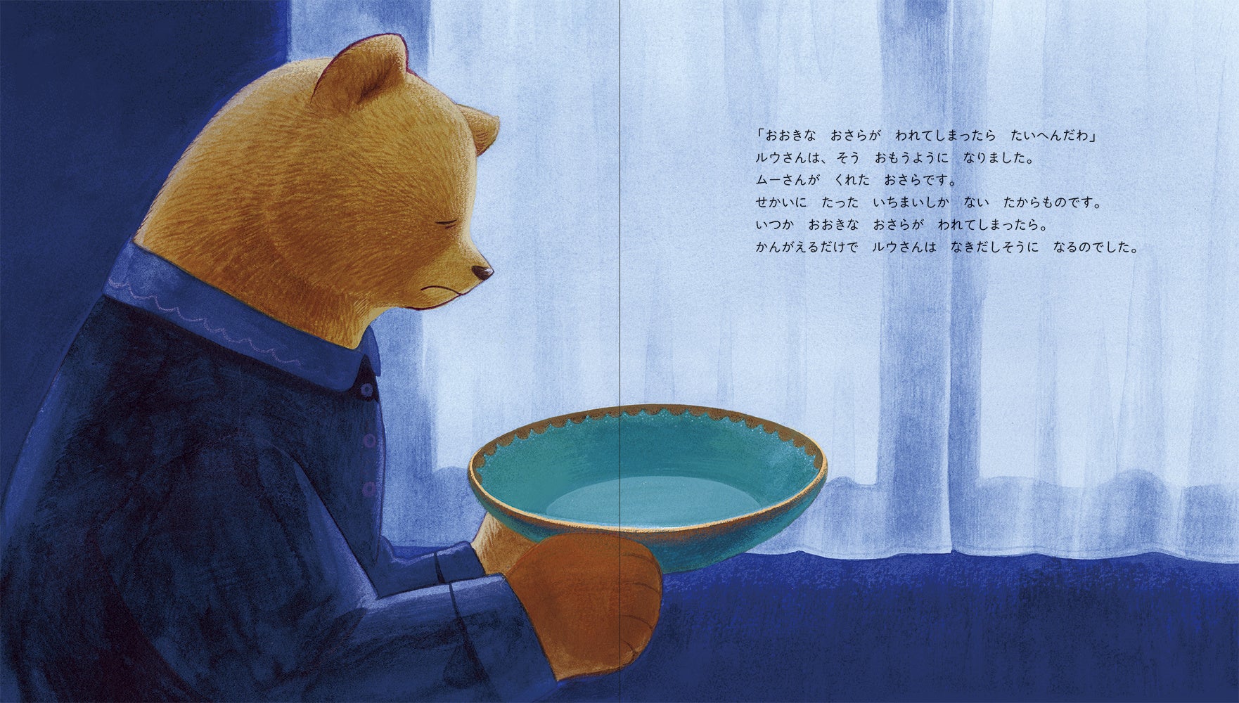 ルウさんの宝物は、ムーさんからもらった大きなお皿。家族のためにお皿いっぱいにごちそうを作り、幸せな時間を過ごしました。ある日、ムーさんが病に倒れます。ふさぎこむルウさんは、お皿をしまいこもうとしますが……。1枚のお皿がつないだ心温まる愛の物語。